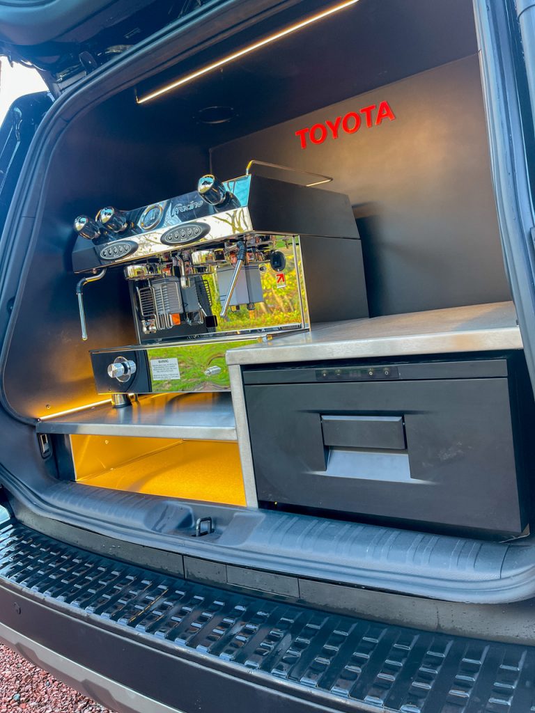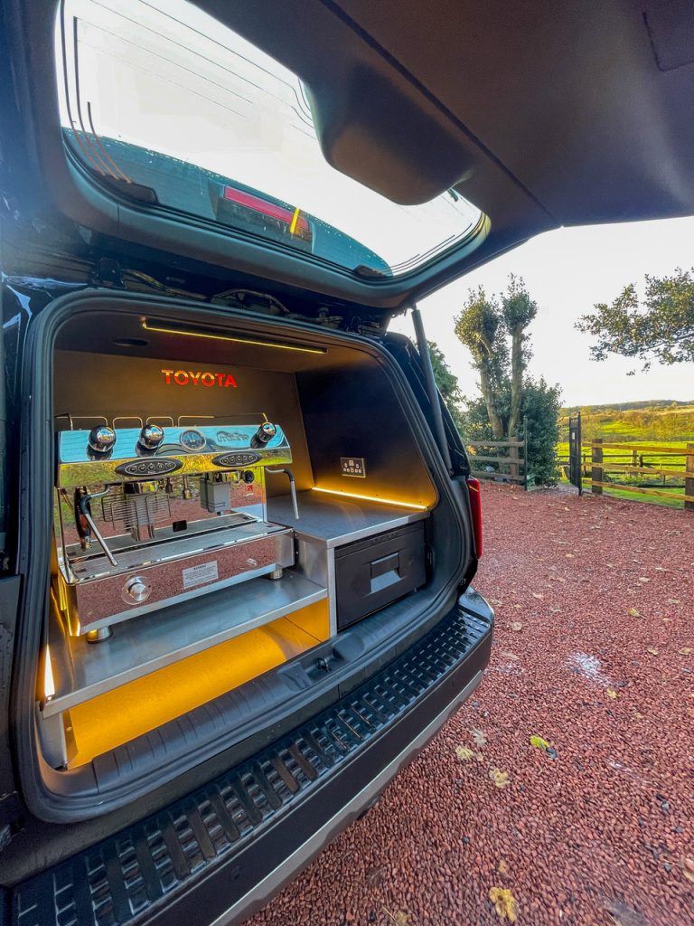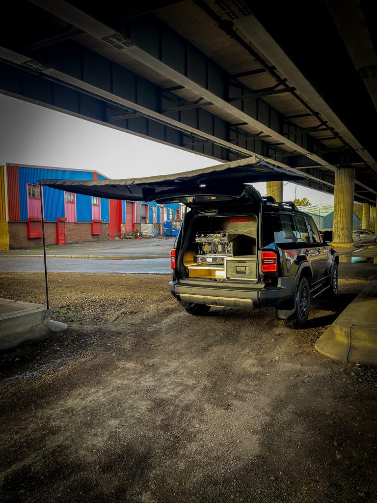 Toyota UK got in touch with us here at Coffee Latino to convert their newly released 2025 Landcruiser model and convert it to serve coffee for their own promotional events. As a sympathetic conversion was needed (so equipment could be removed without sign, if needed) we cleverly utilised all the vehicles existing screw holes / securing point to attach all the framework too. With a black on black theme the rear service area was painted satin black and illuminated with LED mood lighting. This lighting was also carried out on to the massive 270 degree wrap around awning fitted to the custom stainless steel brackets, attaching to the vehicles roof rack bars. The vehicle included: